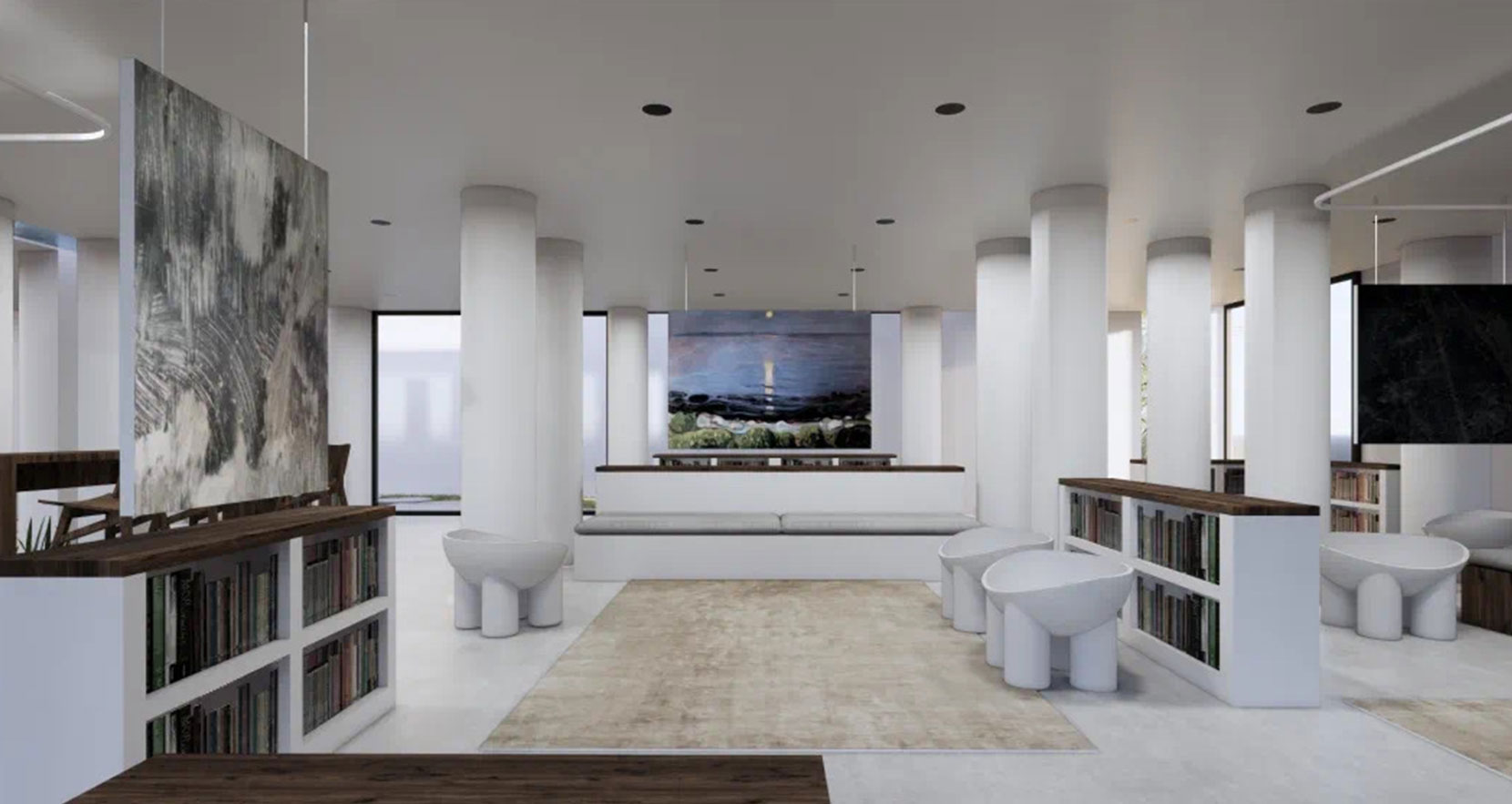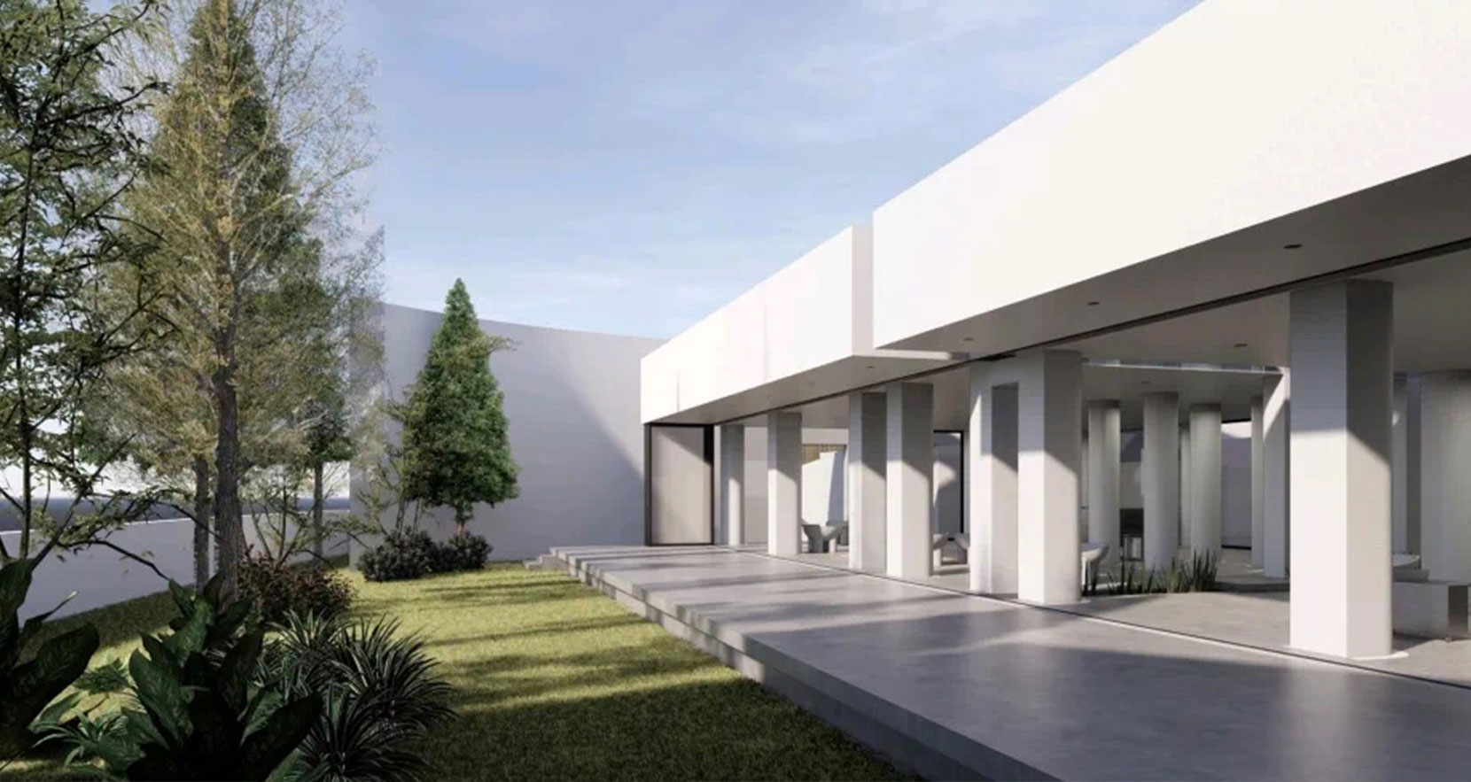 大厅接待处的设计相当简单,设计师在白色的空间内加入木质矮几、鹅黄色羊毛地毯,再运用绿植点缀,减弱了白色的冰冷感,为室内增加些许温馨。白色的墙面与建筑外观相呼应,加上射灯灯光的渲染,让整个空间多了几分艺术气息。围绕大厅外围是一排高耸的松柏与细密的绿植,光影透过一整廊玻璃墙体侵入内,摇曳间空间也因此有了灵性,于是便在走廊逗留了好一会儿。