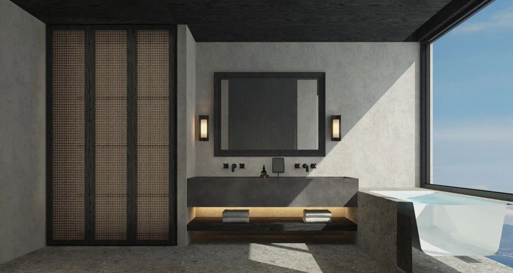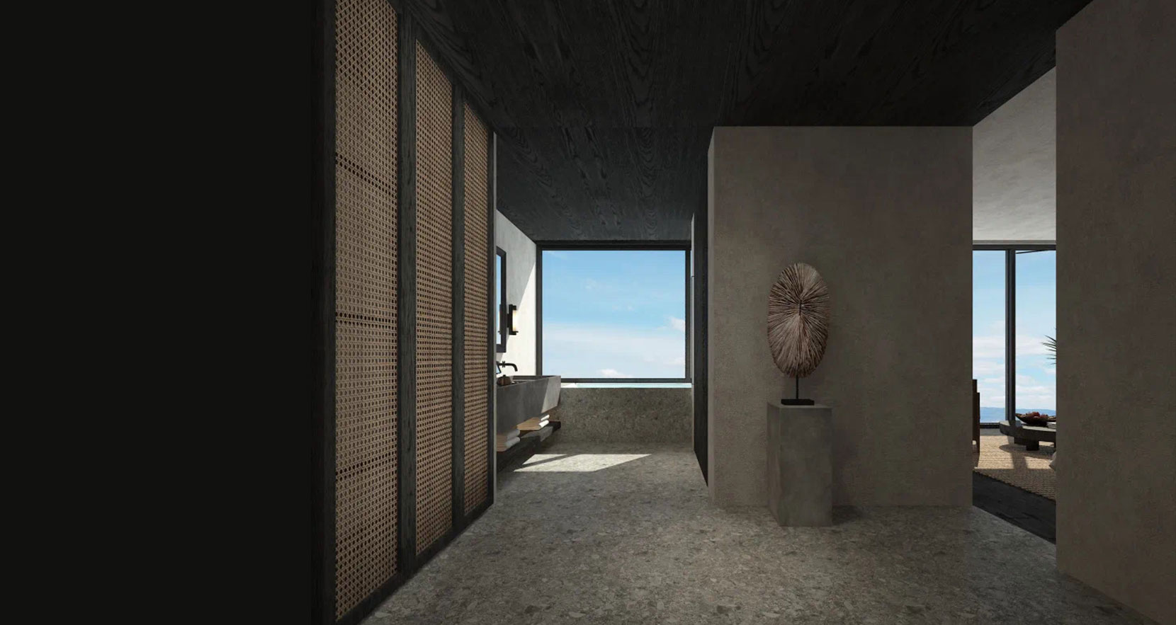进入客房,利落的线条,素雅的色调,再加上错层结构,共同勾勒出一个简单而纯粹的世界,在融入些许艺术点缀,完美演绎出高级的空间感。深色水磨石地板与白色的石灰墙形成对比,淡雅的大理石、木头家具,用丰富的纹理与柔软的织布材质相中和,从布局、家具、色彩以及装饰元素中找到一个正合分寸的平衡点,让每一个住在这里的人都能感受到舒适。