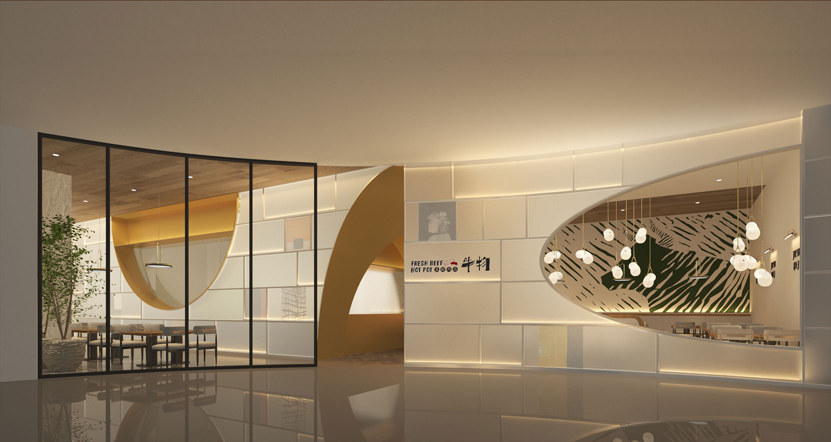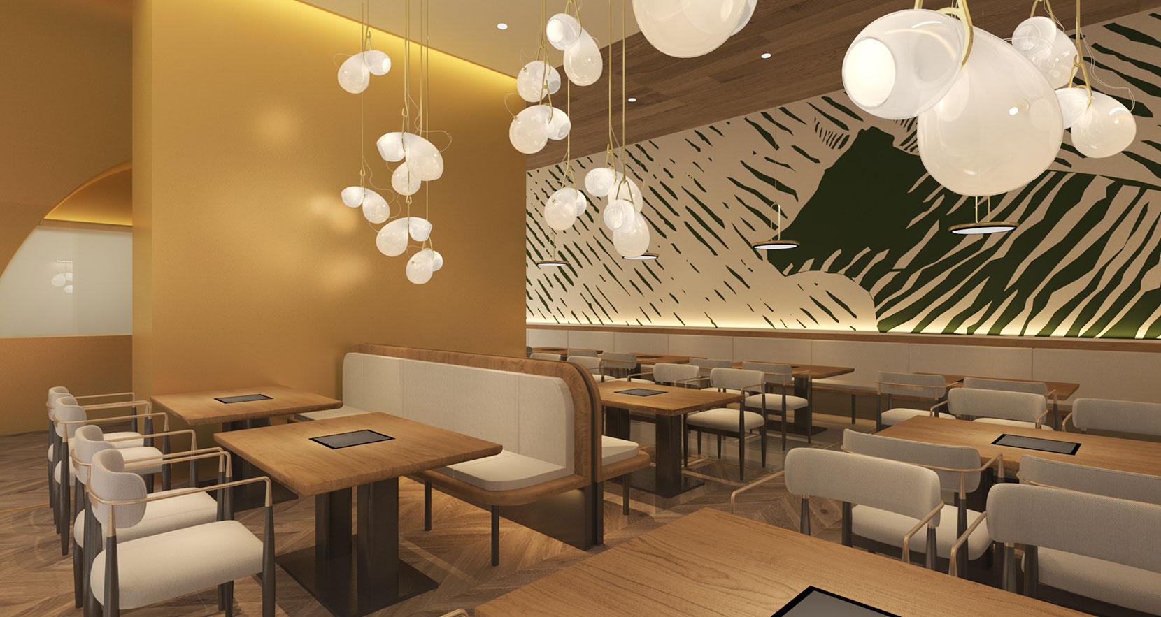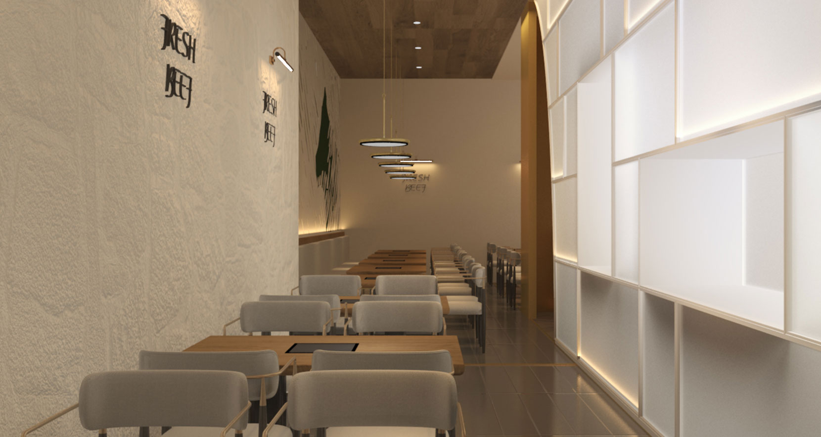 室内就餐空间由小长桌、卡座及长沙发为主,前面部分为小长桌为主,主接待人数较少的客人,同时营造半户外的感受,后面部分则以卡座及沙发,同时集合水吧台和收银等多种复合功能,具备商务宴请、好友聚会小型宴会的接待能力,客人可以在不同的区域得到不同的就餐体验。整间餐厅以暖色为主,刷上不规则的艺术涂料的白色墙壁,带来富有质感的肌理,金色元素打破了环境的厚重感,奢华又不失灵动,木质桌椅的选择略带工业风气息,地砖与地板结合的地面丰富空间的层次,使店面看上去不是那么的单调。