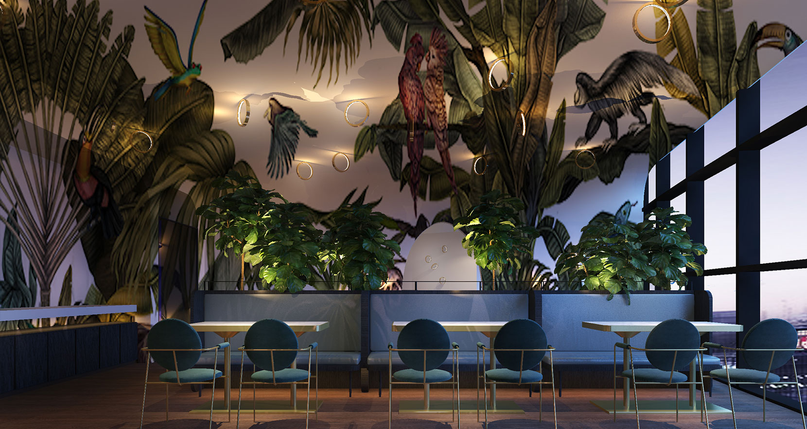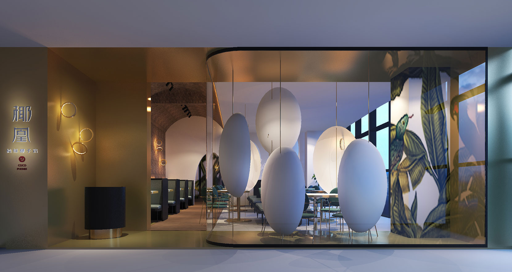 入口部分的区域作为接待以及小桌使用,以“椰壳”为隔断,墙面及椰壳内均有定制的圆环灯,通过“椰壳”与灯光可触可感的氛围围合,营造舒适的用餐体验;中间区域为收银、调料以及卡座区,整个区域通过墙顶的手绘表现,给客人有感官上的过渡性体验,仿佛置身森林之中用餐。最后一个区域则是以大卡座以及包间为主。