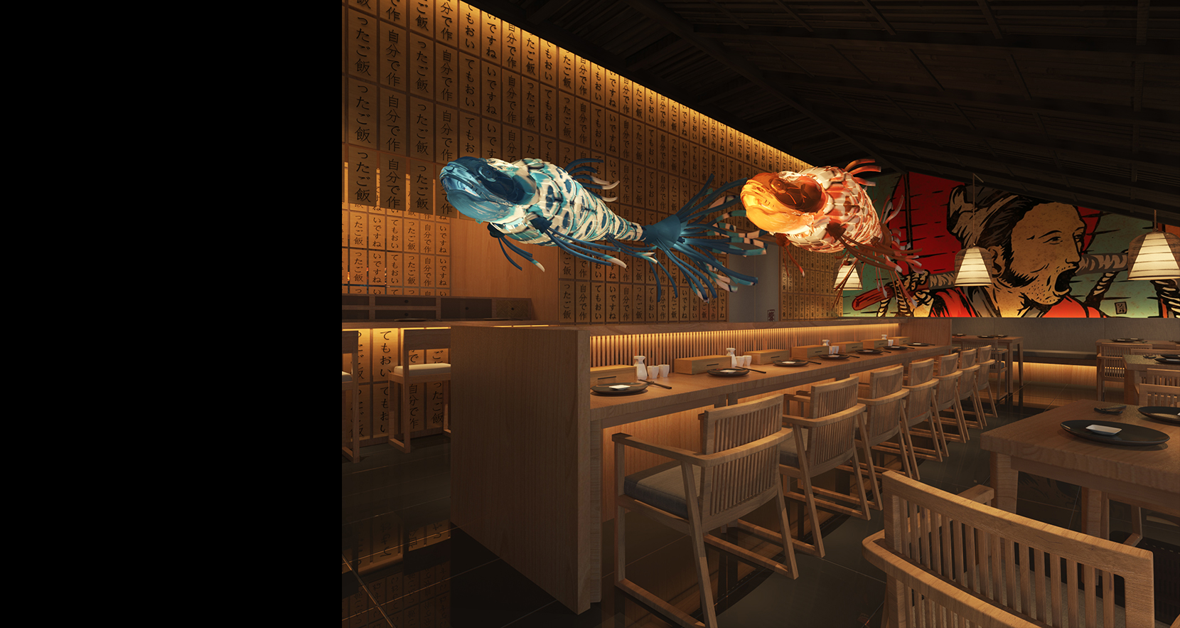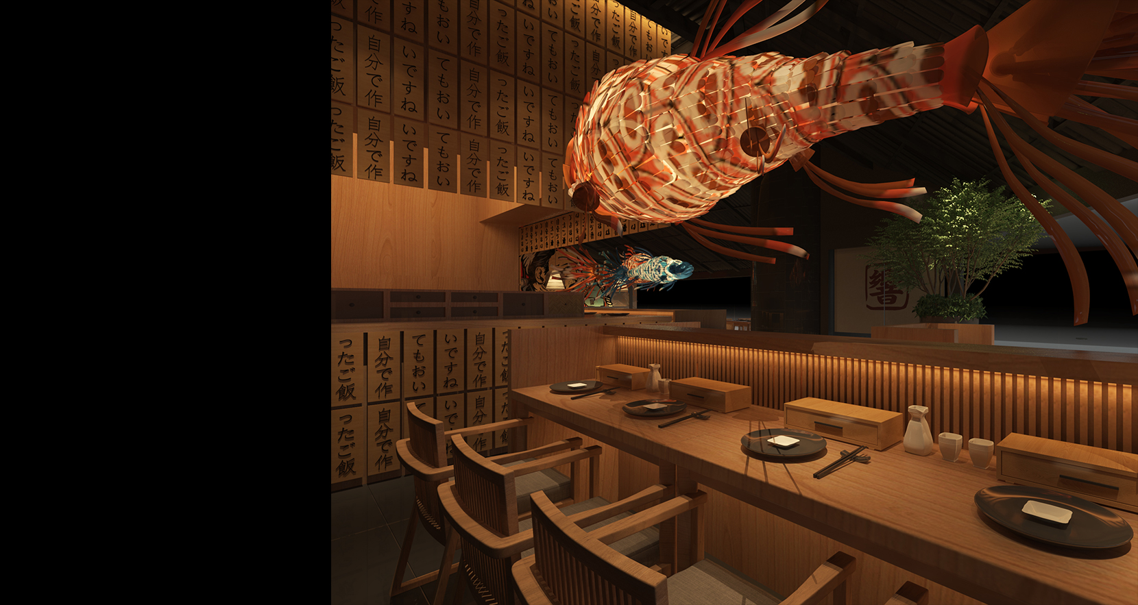 在这个项目中,除了艺术和视觉美感,设计师更多考虑的是如何从经营者的角度以空间设计带动消费,并从消费者的视角去感受空间的愉悦度以及归属感。整个空间以黑色和原木色为主,搭配特有的元素,反而不显得沉闷压抑,别具趣味。厅里灯光不算明亮,重点聚焦餐桌空间幽暗,神秘,沉浸式体验感很强。空间多样化的同时要保证设计的整体性,质感间的统一,也正是呼应了日式菜品在色香味形上的讲究,让就餐仪式感油然而生。