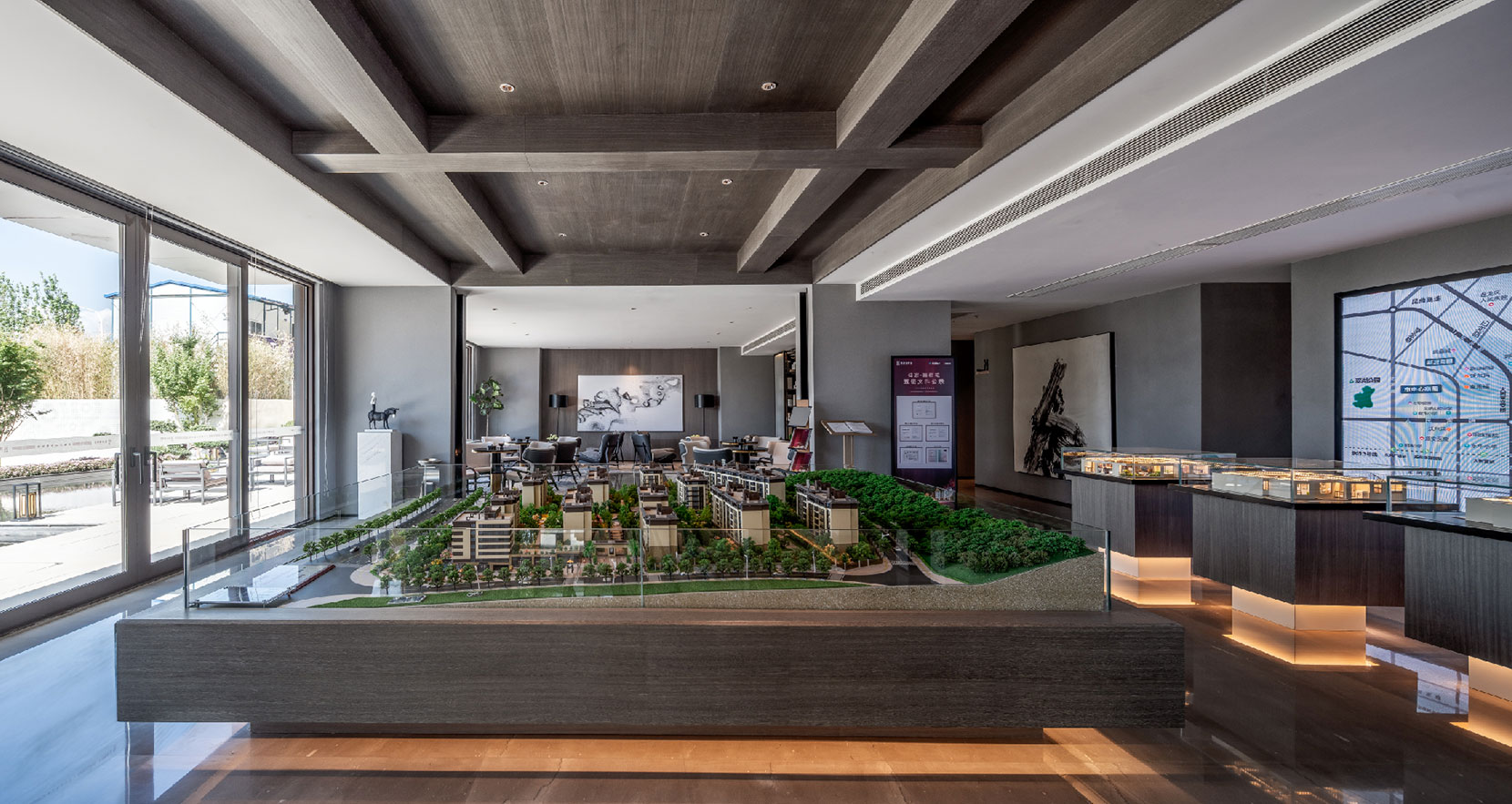 沙盘区,原有的空间结构被打碎重造,木质结构的吊顶于空间中流动、延展。勾勒出简洁的设计语言,展现空间的生命力,塑造别样的参观体验。整体空间以黑白灰咖四色为整体基调,接待台与背景墙运用不同的交错方式,营造空间的设计感与视觉亮点。
