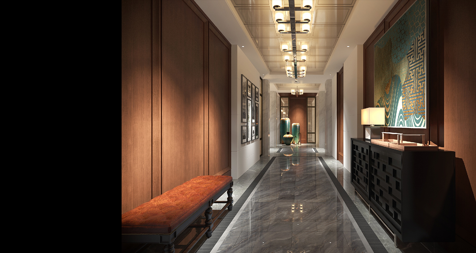 玄关处大色块的暖棕色和灰白相间水磨石地面与墙面互相衬托,高级华丽,小小的空间都能营造出艺术的张力。