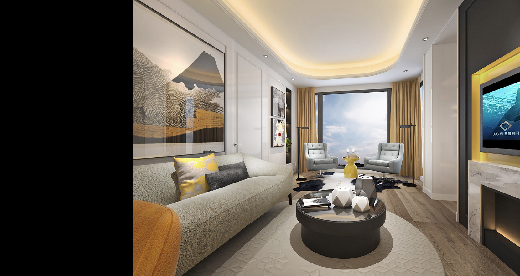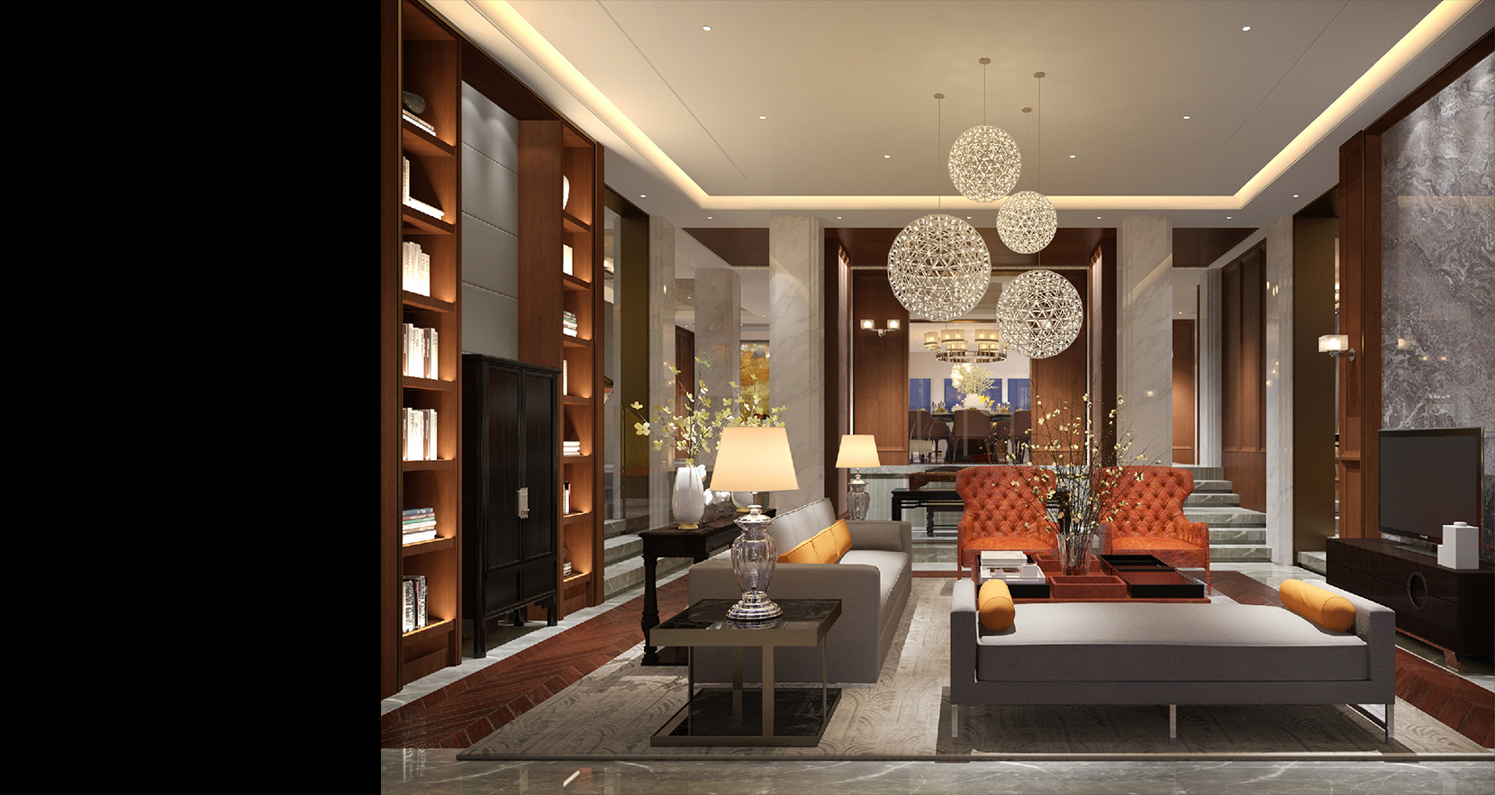 开放式空间设计,客厅、餐厅、厨房互通互联,让家充满当代时尚的设计格调,大理石的肌理与木饰面完美契合,搭配灰调融合,橘色点睛,空间之中传递理性与质感,将现代风格与奢华气息在空间里融合,再加入艺术元素,曲线蜿蜒的单人沙发让空间更有温度。