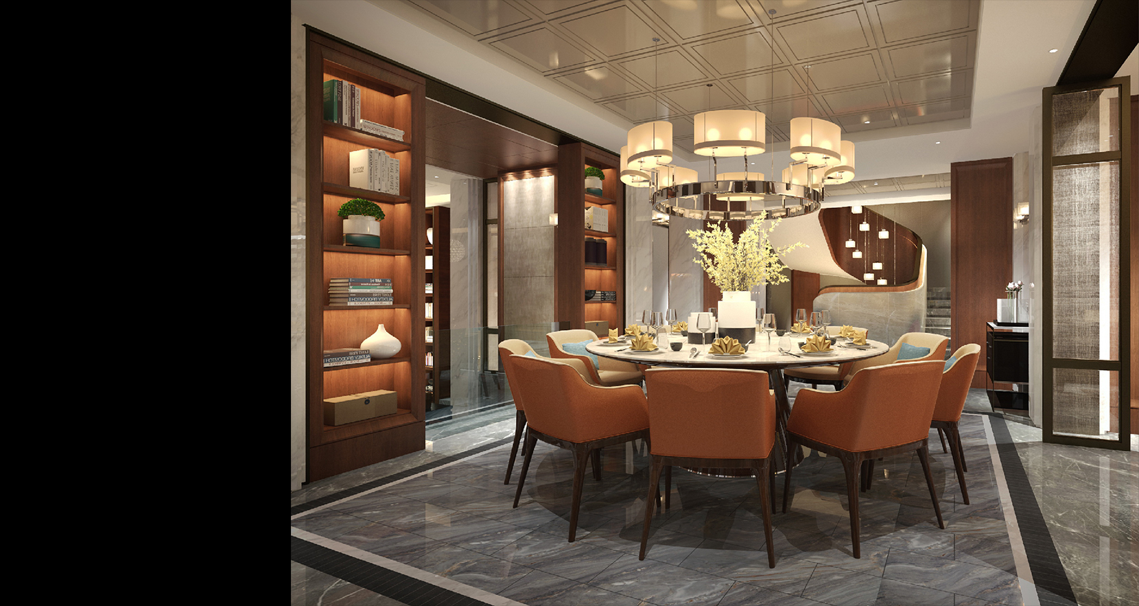 餐厅通过细边棕色边框玻璃折叠门,保留光线穿透性的玻璃,在开放与封闭式之间自由切换。餐桌后的背景墙富有艺术格调,是当代室内不可少的设计元素,黑白相间的大理石圆桌搭配橘色的餐椅,餐厅空间端庄又不失活力,环形楼梯搭配雨落式的吊灯,让整个空间梦幻而不失时尚感。
