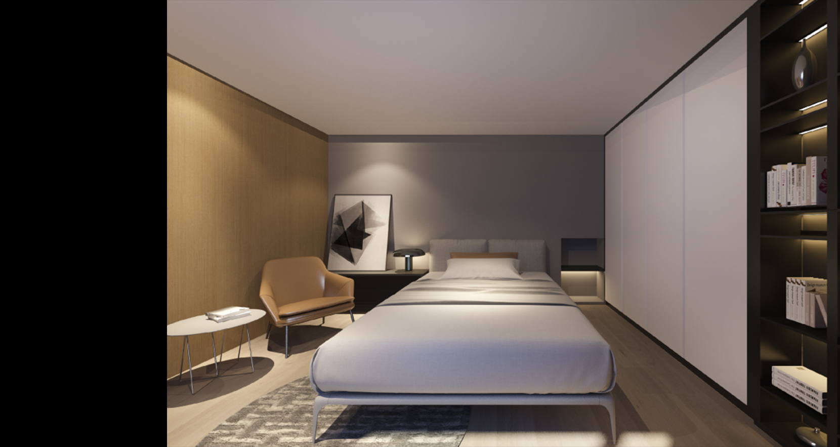 卧室延续开放式空间设计,安静的灰调与暖色的木制地板造成视觉上温润的效果,一点点鹅黄色点缀,简单却不单调的颜色搭配,过滤了原本饱和度的强烈和浓重,显得更加柔和优雅。